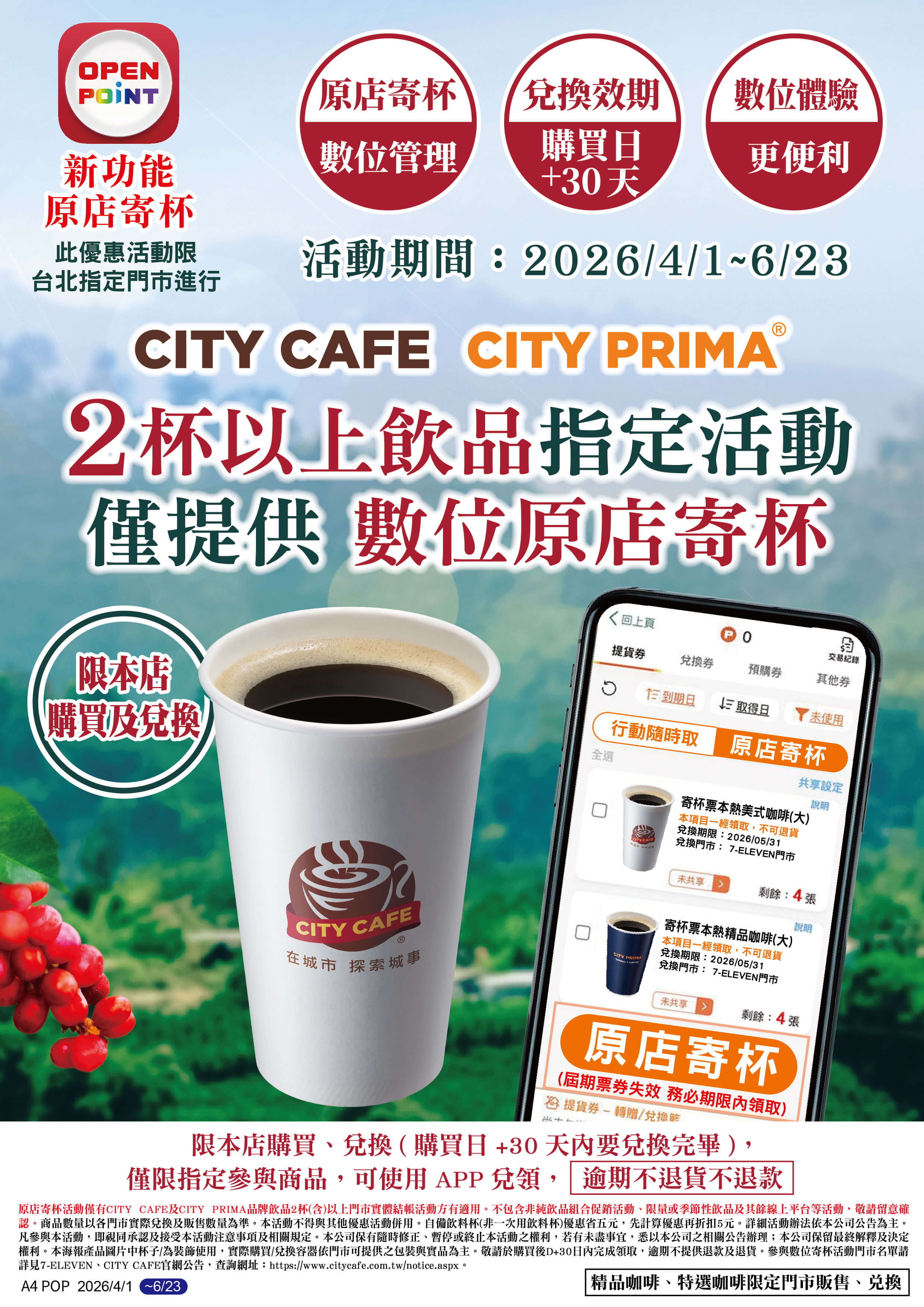 原店寄杯活動僅有CITY CAFE及CITY PRIMA品牌飲品2杯(含)以上門市實體結帳活動方有適用。不包含非純飲品組合促銷活動、限量或季節性飲品及其餘線上平台等活動,敬請留意確認。商品數量以各門市實際兌換及販售數量為準。本活動不得與其他優惠活動併用。自備飲料杯(非一次用飲料杯)優惠省五元,先計算優惠再折扣5元。詳細活動辦法依本公司公告為主。凡參與本活動,即視同承認及接受本活動注意事項及相關規定。本公司保有隨時修正、暫停或終止本活動之權利,若有未盡事宜,悉以本公司之相關公告辦理;本公司保留最終解釋及決定權利。本海報產品圖片中杯子/為裝飾使用,實際購買/兌換容器依門市可提供之包裝與實品為主。敬請於購買後D+30日內完成領取,逾期不提供退款及退貨。參與數位寄杯活動門市名單請詳見7-ELEVEN、CITY CAFE官網公告,查詢網址:https://www.7-11.com.tw/。
