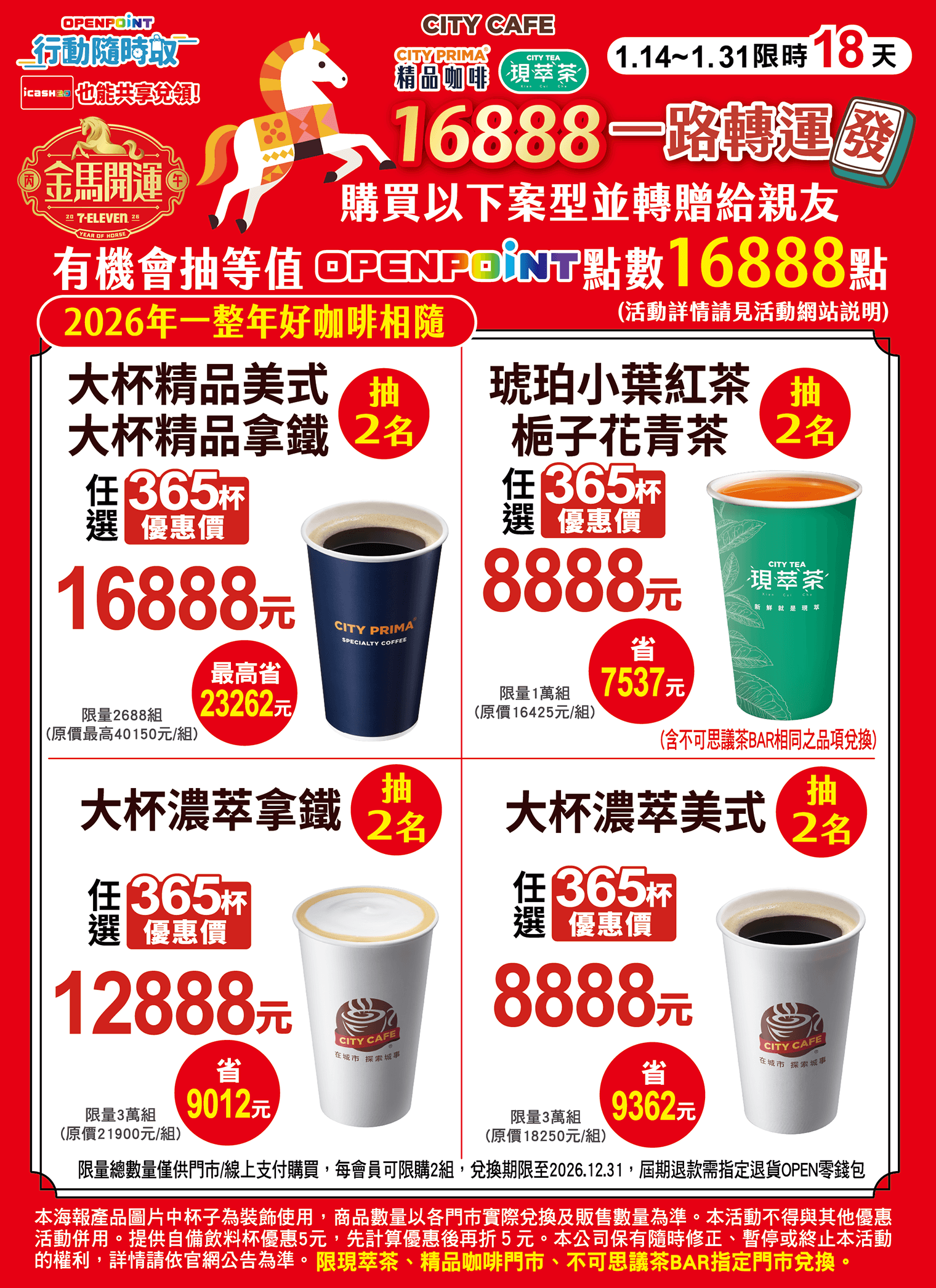 - 春節16888元指定活動: 大杯精品美式或大杯精品拿鐵16888元365杯(抽2名),商品兌換可至2026/12/31。