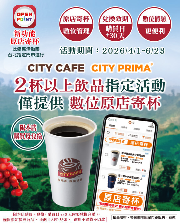 即日起,CITY CAFE、CITY PRIMA、CITY TEA現萃茶、CITY PEARL、不可思議咖啡、思樂冰、雪淋霜霜淇淋、酷聖石冰淇淋/霜淇淋、不可思議茶BAR、自助區熱食商品(包含蒸/烤地瓜、蒸/烤馬鈴薯、包子、蒸玉米、茶碗蒸、熱狗/大亨堡、各式風味蛋品等、哈燒、關東煮、滷味等)…等特定線下活動,不適用於部分指定特殊門市。